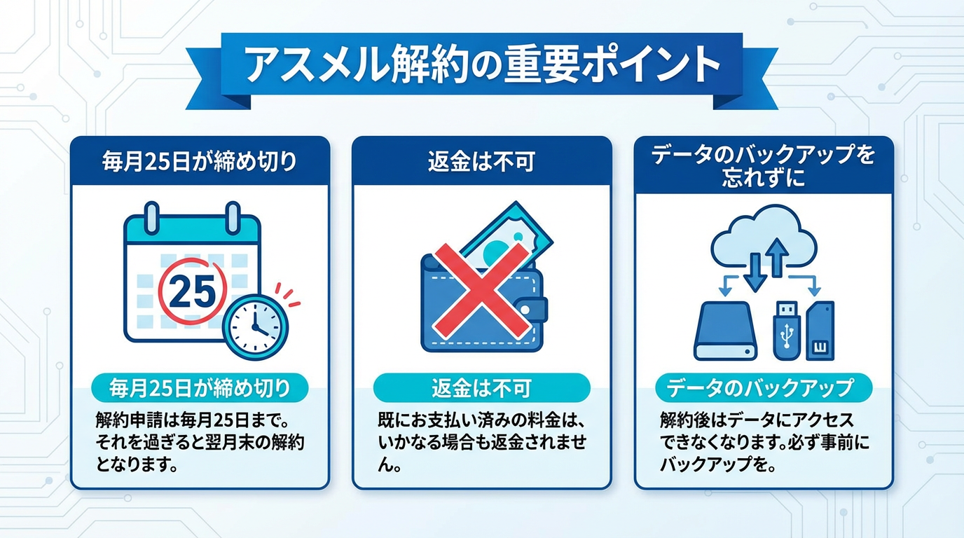 アスメルの解約は決して難しくありませんが、締切日・返金不可・データバックアップという3つの重要ポイントを押さえておくことが大切です。