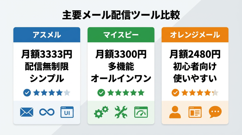 アスメルの導入を検討する際、必ず比較したい主要なメール配信ツールをご紹介します。