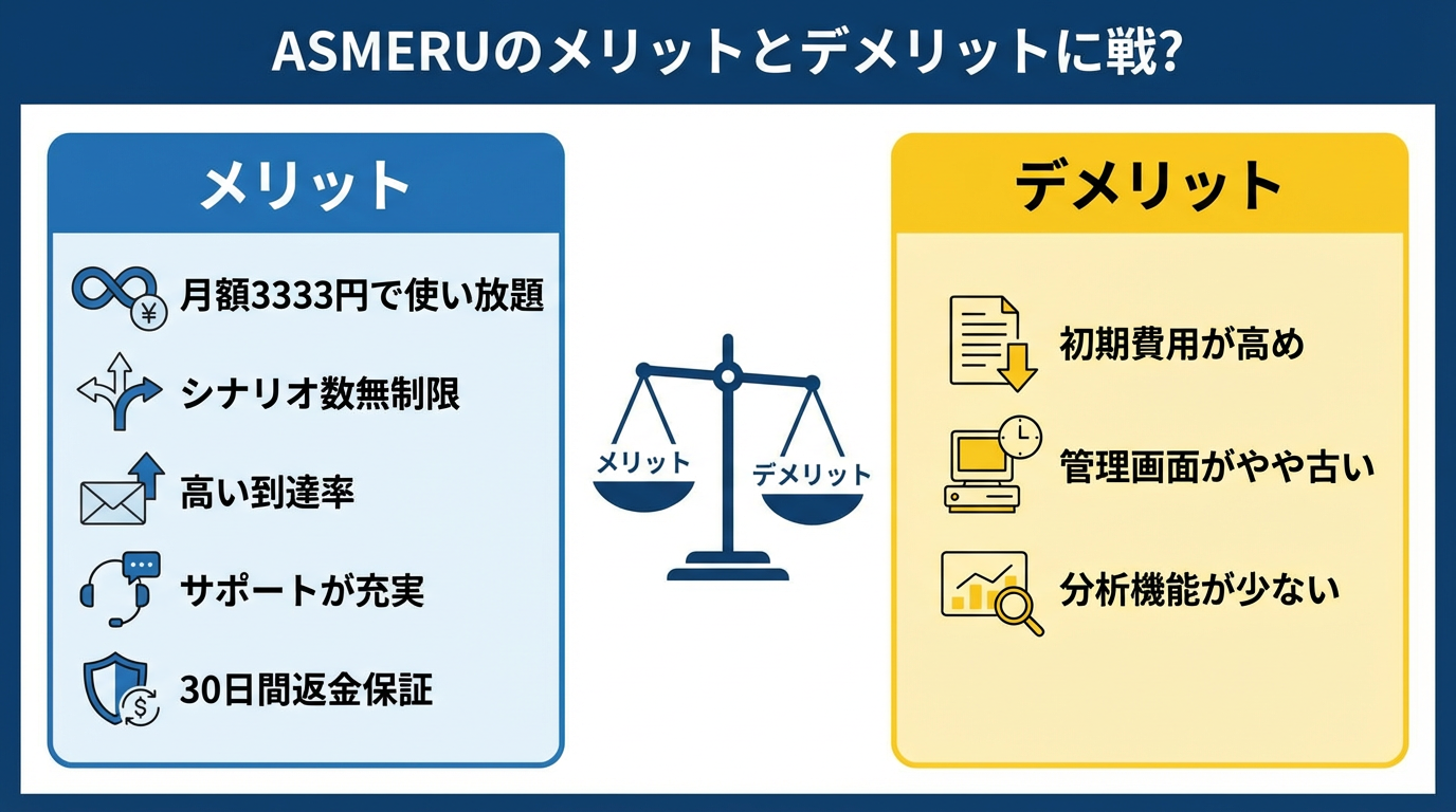 アスメルの評判・口コミを総合すると、コスパの良さ、高い到達率、充実したサポートが高く評価されている一方で、初期費用の高さや管理画面の古さが指摘されています。