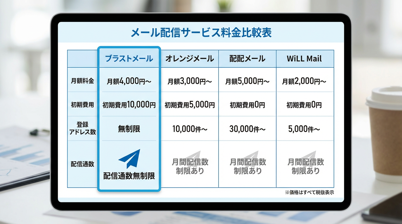この記事では、メール配信システムのおすすめを紹介する当サイトが、ブラストメールと主要な競合サービス(オレンジメール・配配メール・WiLL Mail)の料金を徹底比較します。