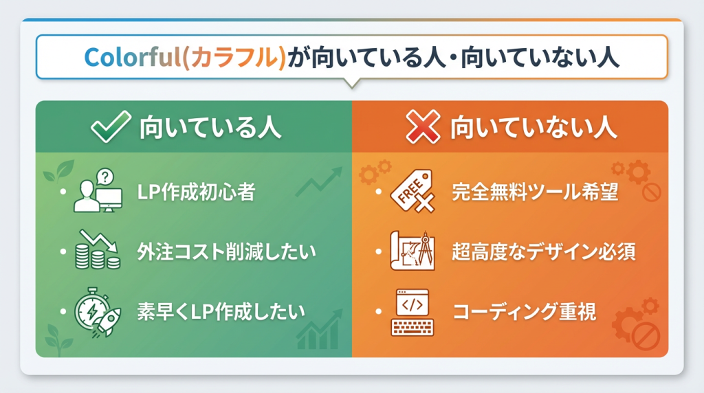 カラフル(Colorful)のLP事例と機能を詳しく解説してきましたが、まとめると以下のポイントが重要です。