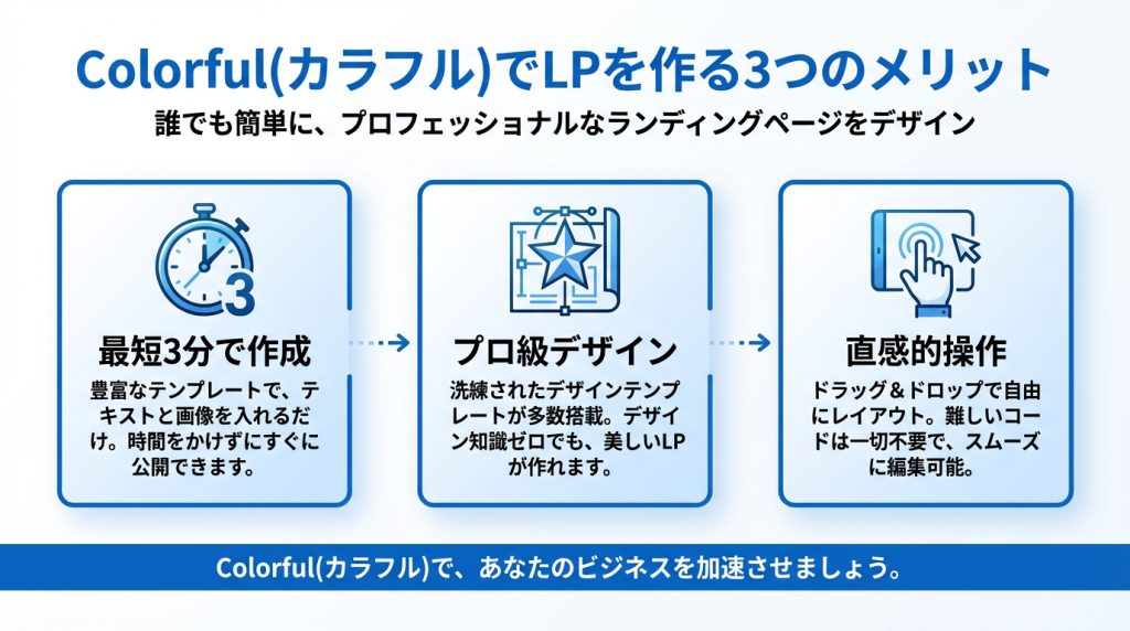 カラフル最大の特徴は、驚異的なスピードでLPを作成できること。通常、LPを外注すると数週間〜1ヶ月かかりますが、カラフルなら最短3分で公開できます。