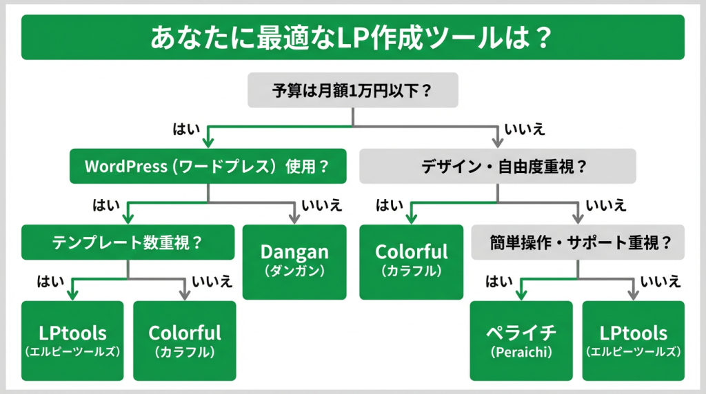 主要LP作成ツール5社を徹底比較した結果、総合的にColorful(カラフル)が最もバランスが良いことがわかりました。