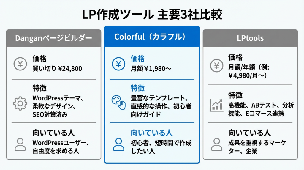 A. Colorfulは汎用性が高く初心者向け、LPtoolsは成約率重視のプロ向けです。LPtoolsは価格が32,780円と高額ですが、実績のあるテンプレートが使えます。ただし、当サイト限定の「LP成約率を劇的に高める30の実践テクニック集」をColorfulと組み合わせることで、初心者でも高い成約率を実現できます。