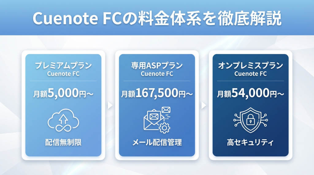 Cuenote FCには、提供形式や機能によって3つの主要プランが用意されています。それぞれの費用と特徴を詳しく見ていきましょう。