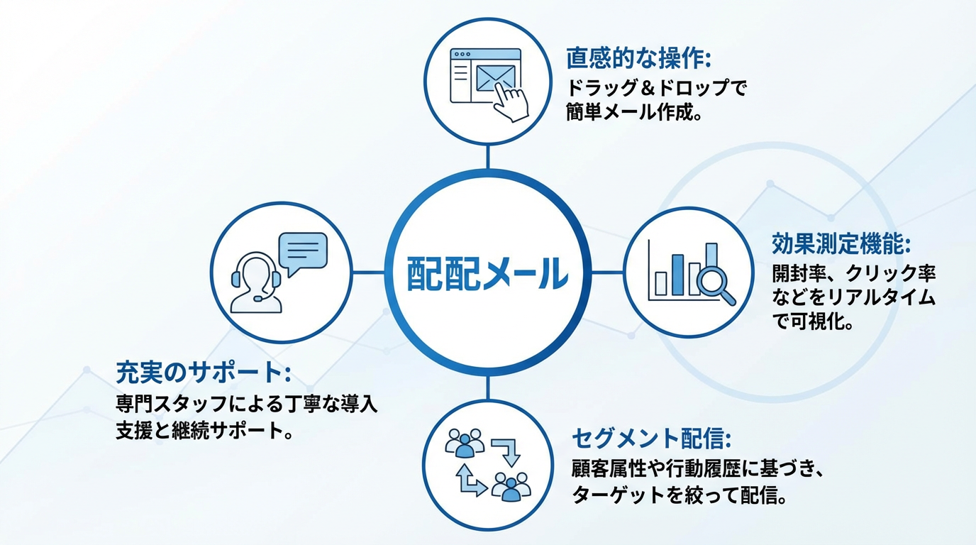 メール配信後の開封率・クリック率・到達率をリアルタイムで確認できる効果測定機能が充実しています。