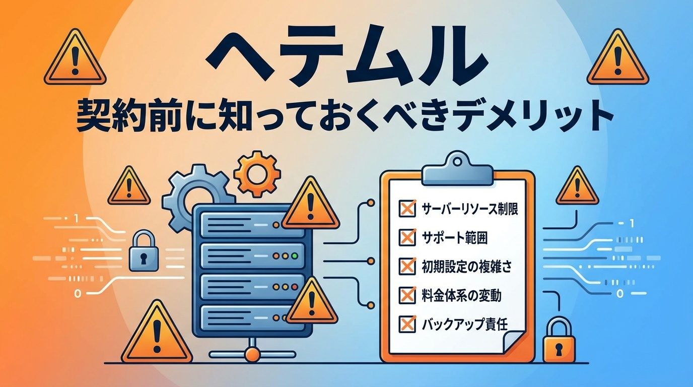 「ヘテムル(heteml)って実際どうなの?デメリットはないの?」レンタルサーバー選びで失敗したくない方にとって、契約前にデメリットを知っておくことは極めて重要です。この記事では、ヘテムルの7つのデメリットを忖度なしで徹底解説します。向いている人・向いていない人も明確にお伝えしますので、後悔しないサーバー選びにお役立てください。