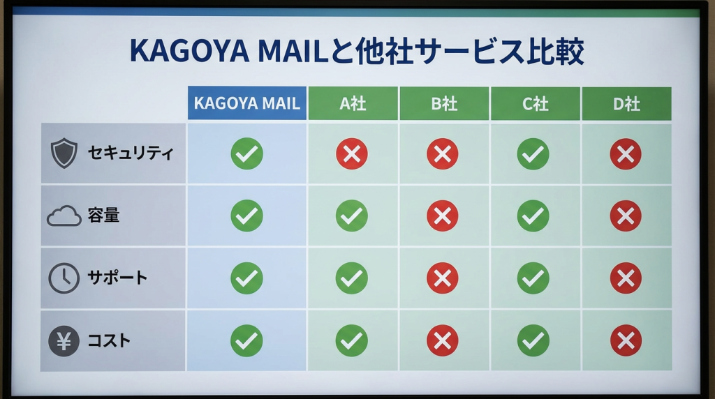 まずは、KAGOYA MAILと主要な他社サービスの基本的な違いを理解しましょう。