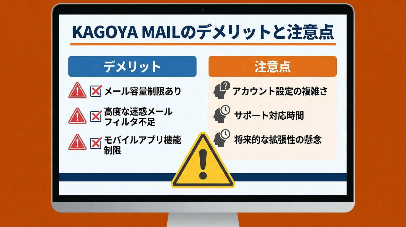 KAGOYA MAILはビジネスメール運用に特化した優れたサービスですが、以下のデメリットがあることを理解しておきましょう: