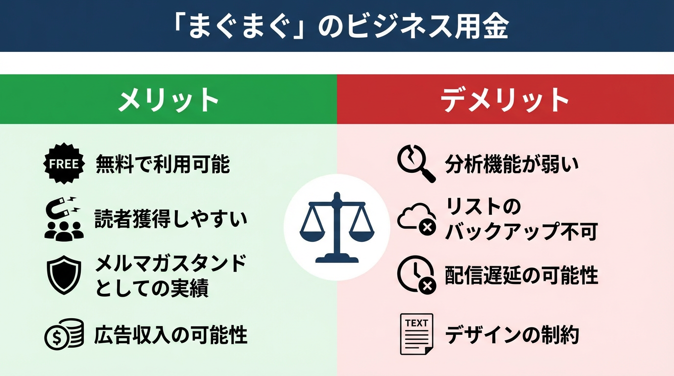 これは最大のデメリットです。まぐまぐでは読者のメールアドレスリストをエクスポートできません。つまり、読者データが完全にまぐまぐに依存してしまい、万が一サービスが終了したり、他のツールに移行したくなった場合、読者リストを持ち出せません。