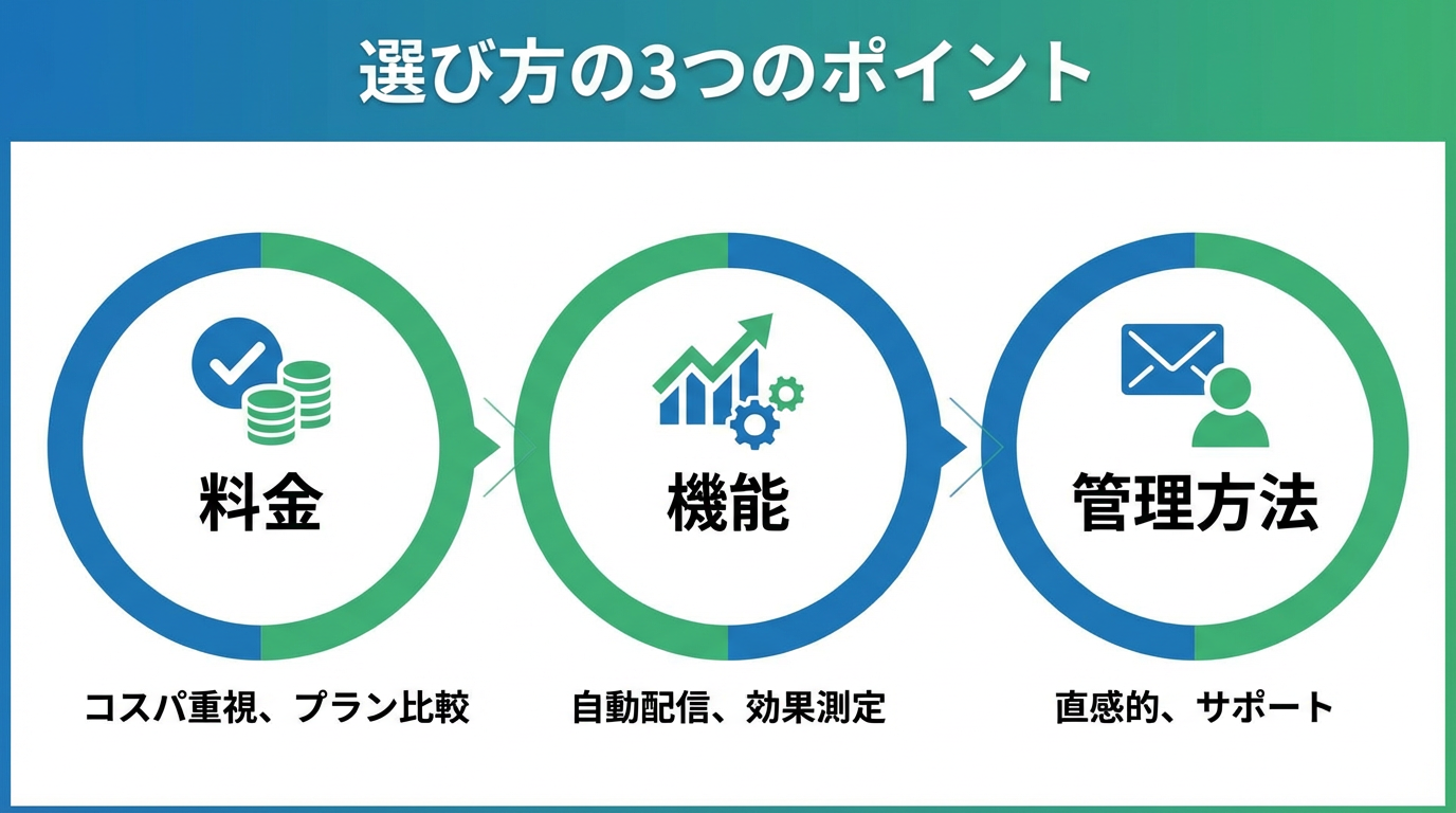 どのツールが自分に合っているかまだ迷っている方は、画像1枚で最適なメール配信ツールが分かる【完全ガイドフローチャート】をご活用ください。