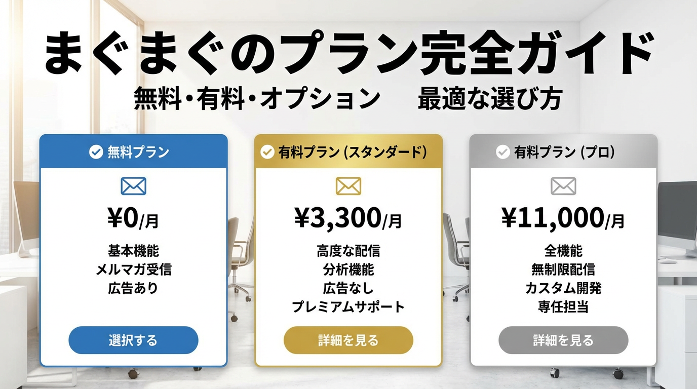 まぐまぐでメルマガを始めたいけれど、「無料プランと有料プランの違いは?」「有料配信メニューって何?」「どのプランを選べばいいの?」と迷っていませんか。まぐまぐには複数のプラン・オプションがあり、それぞれ特徴が異なります。