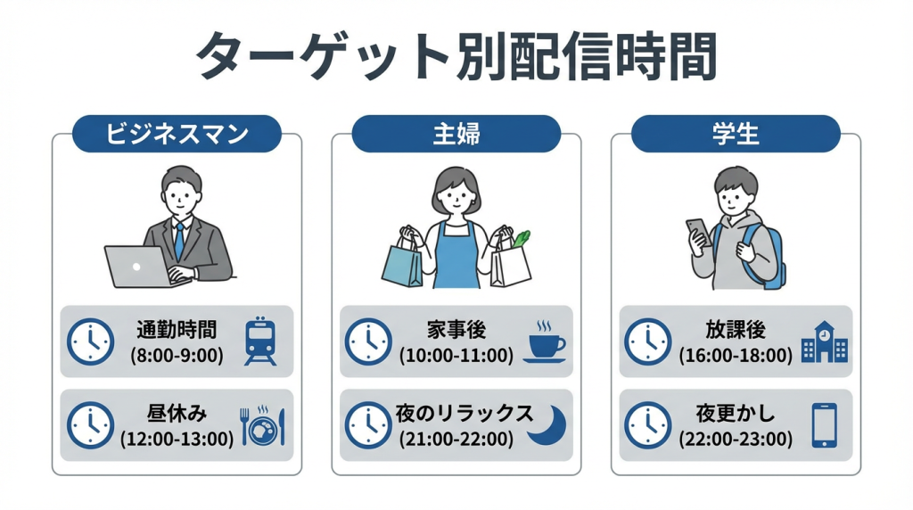 ターゲット層によって生活リズムが異なるため、最適な配信時間も変わります。ここでは主なターゲット別に具体的な時間帯を紹介します。