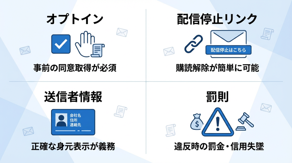 • 3つの表示義務を守る:送信者情報、配信停止方法、適切な件名