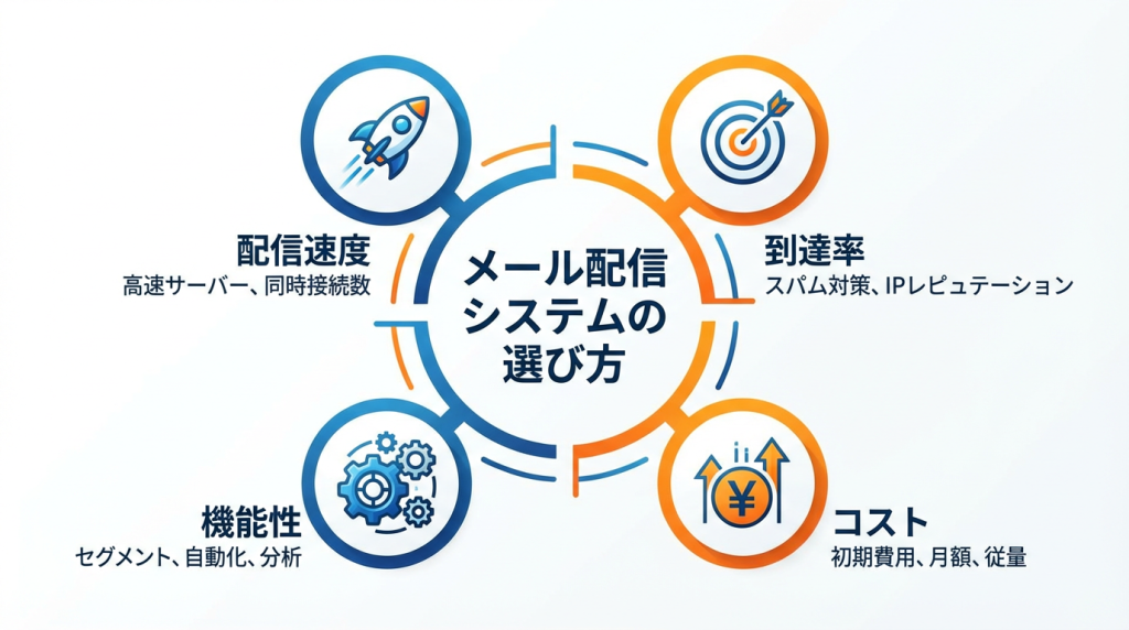 メルマガ配信システムを選ぶ際は、以下の4つのポイントを押さえましょう。