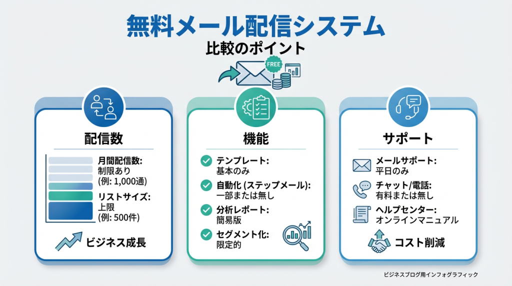 無料メール配信システムには、導入しやすいというメリットがある一方で、いくつかの制約も存在します。ここでは両面から詳しく見ていきましょう。