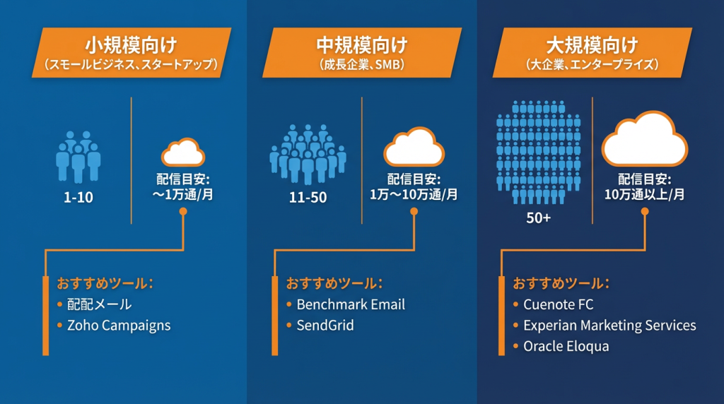 企業の規模や配信数に応じて、最適なメール配信システムは異なります。以下を参考にしてください。