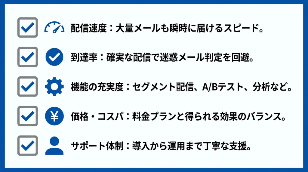 メール配信システムを選ぶ際には、以下の5つのポイントを押さえましょう。