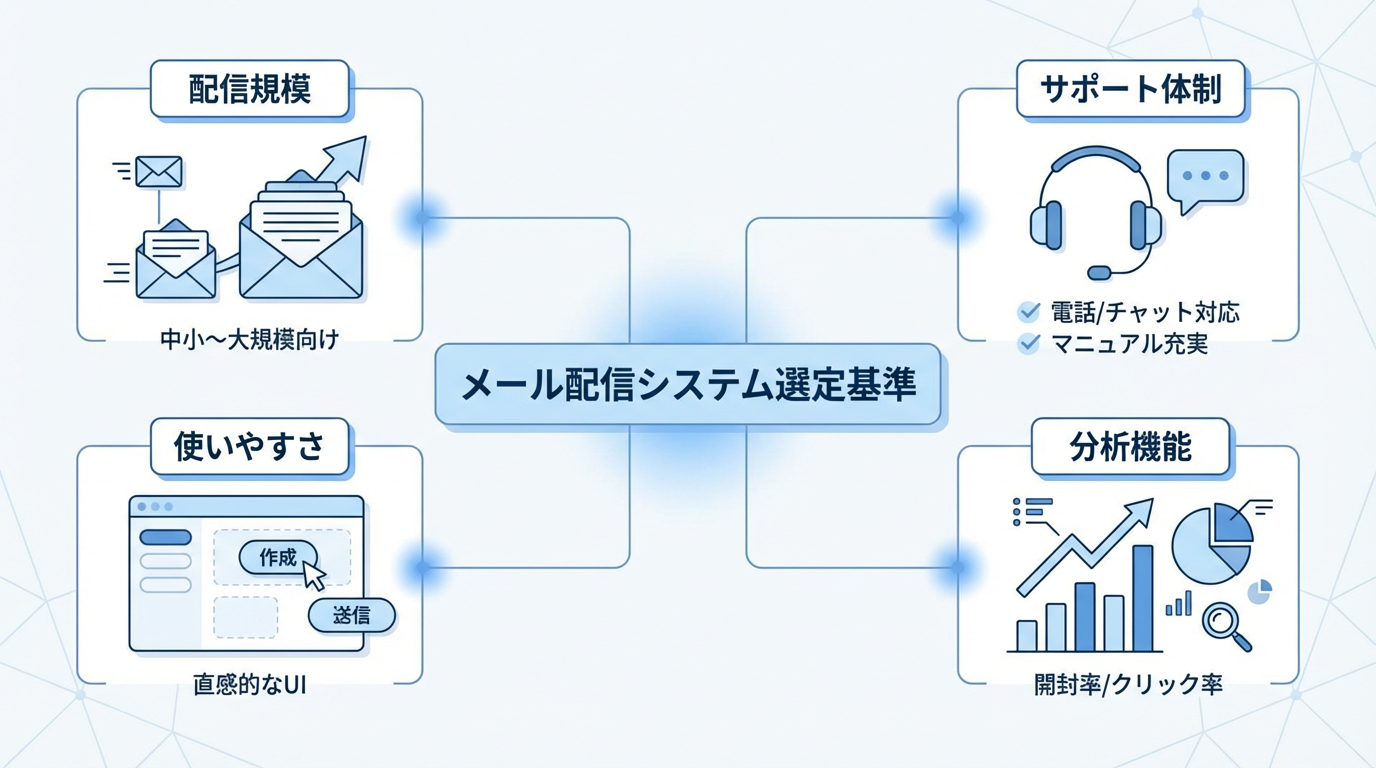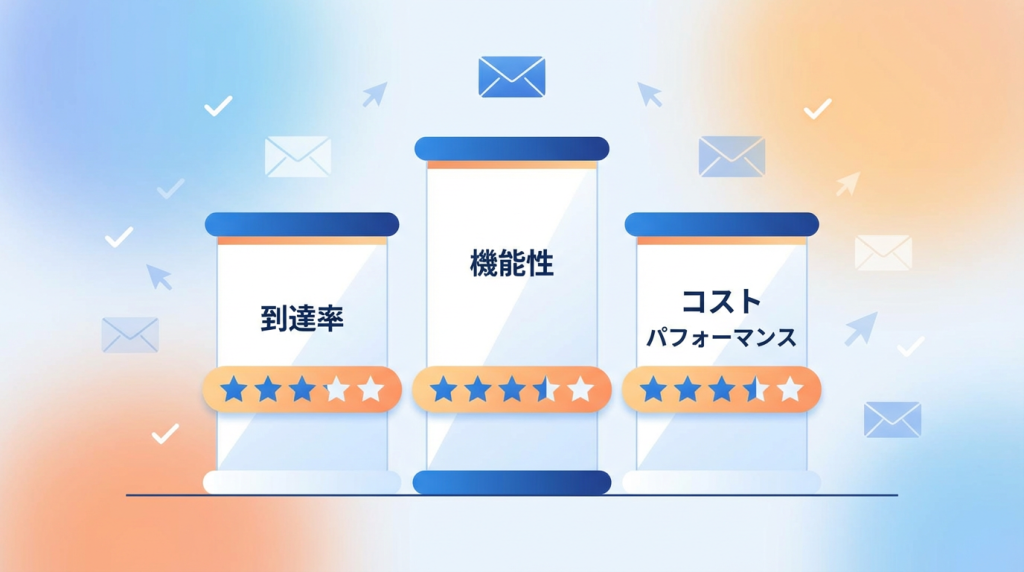 メール配信システムの評価において、最も重要なのは以下の3つの軸です。