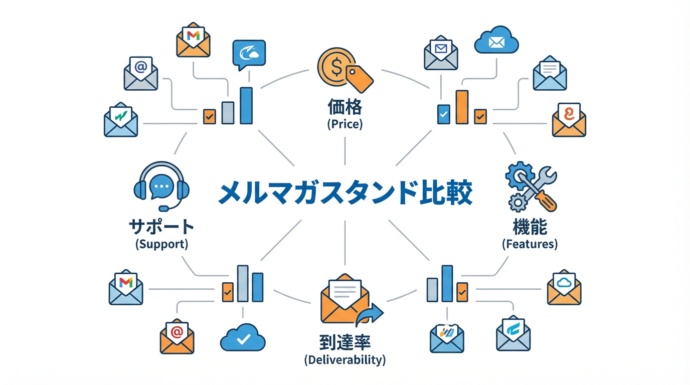 配信速度、到達率、料金体系、機能の充実度など、比較すべきポイントは多岐にわたります。