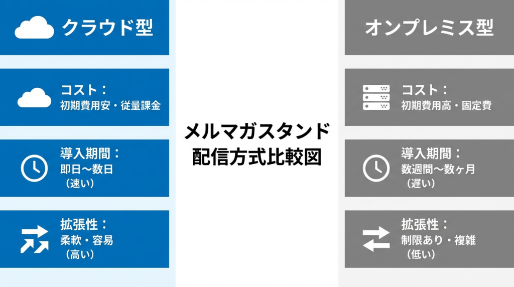 メルマガスタンドには、クラウド型とオンプレミス型の2つの提供形態があります。それぞれの特徴を理解して選びましょう。
