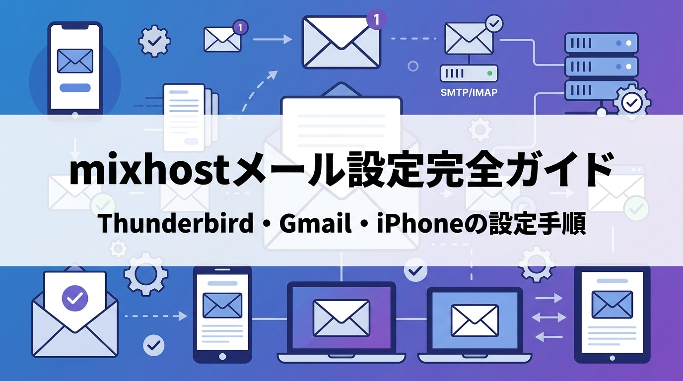 mixhost(ミックスホスト)でサーバーを契約したら、独自ドメインのメールアドレスを作成して、使い慣れたメールソフト(メーラー)で送受信できるように設定したいですよね。でも「cPanelって何?」「IMAPとPOPどっちを使えばいい?」と迷ってしまう方も多いはずです。この記事では、mixhostでのメールアドレス作成から、Thunderbird・Gmail・iPhoneへのメーラー設定まで、初心者でも迷わないよう手順を丁寧に解説します。