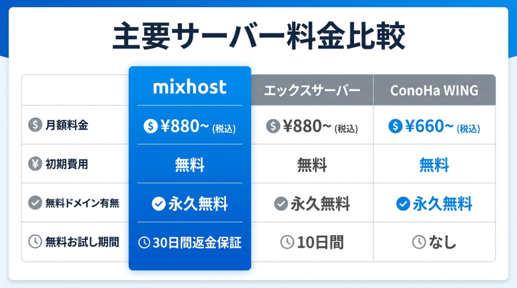 mixhostと主要レンタルサーバー2社の料金を比較します。
