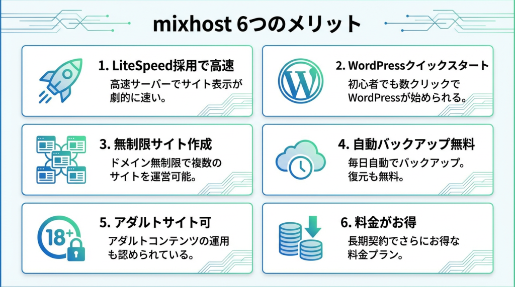 実際の利用者の口コミから、mixhostの良い評判を7つのメリットにまとめました。