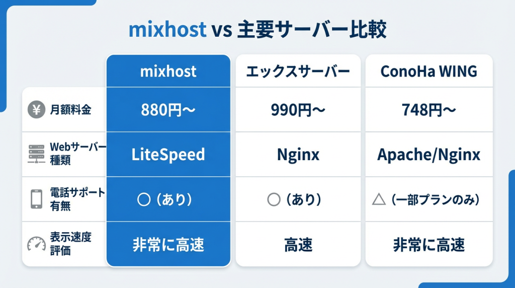| 項目 | mixhost | エックスサーバー | ConoHa WING |