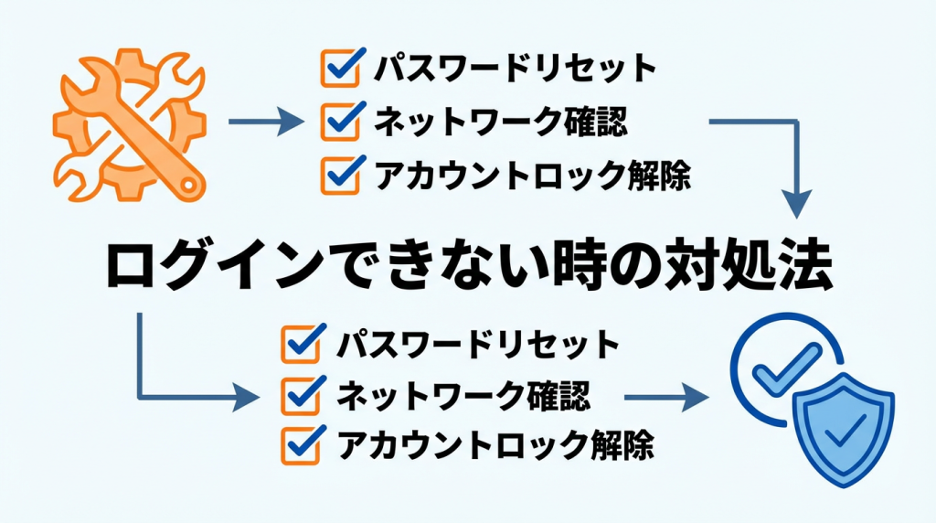 - ✅ ログインできない時は入力ミス、パスワード忘れ、URL間違いを確認