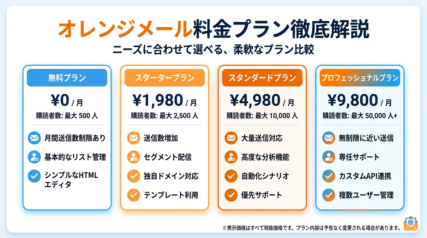 オレンジメールは月額料金が業界最安値クラスでありながら、ステップメール機能や効果測定など、必要十分な機能を備えています。より詳しい比較は、メルマガ配信ツール徹底比較の記事もご参照ください。