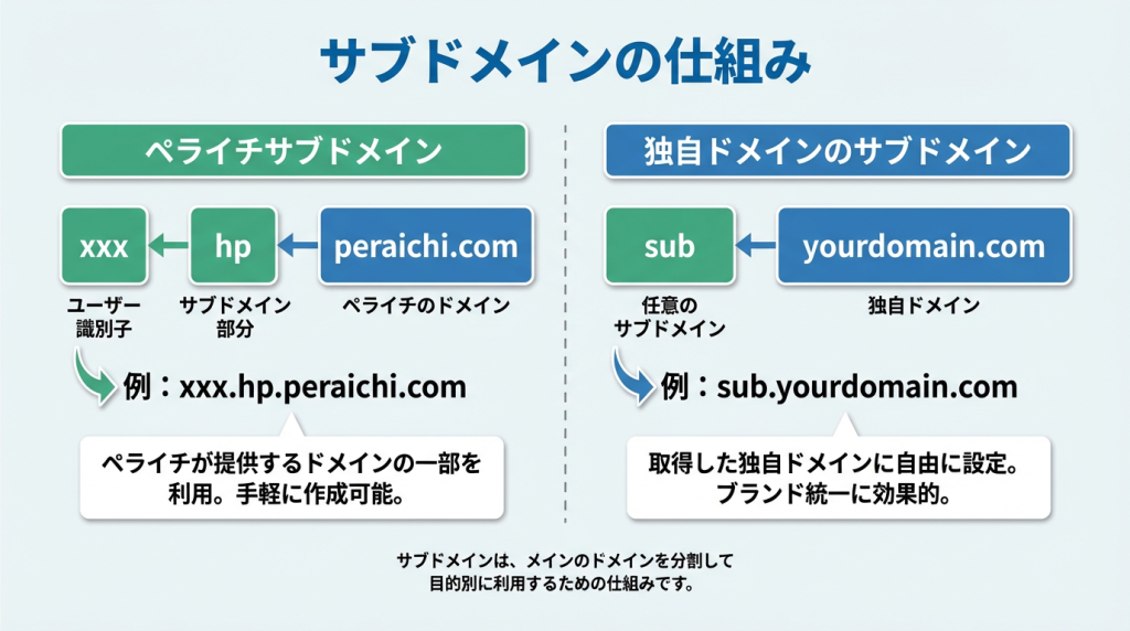 ペライチサブドメインURLと独自ドメインのサブドメインの違い