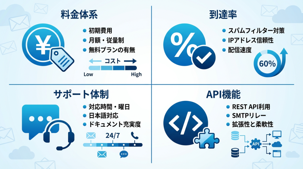 SendGridの代替サービスを選ぶ際は、4つの重要な比較ポイントを押さえることが成功の鍵です。