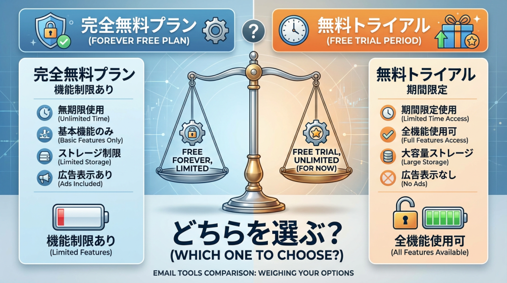 ステップメールツールの「無料」には、大きく分けて2つのタイプがあります。この違いを理解せずに選ぶと、後で「思っていたのと違った」ということになりかねません。