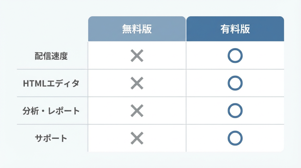 無料プランと有料プランでは、配信数の上限、利用できる機能、サポート体制に大きな違いがあります。無料版は気軽に始められる反面、HTML作成機能や高度な分析機能が制限されることが多く、配信速度や到達率にも差が出る場合があります。