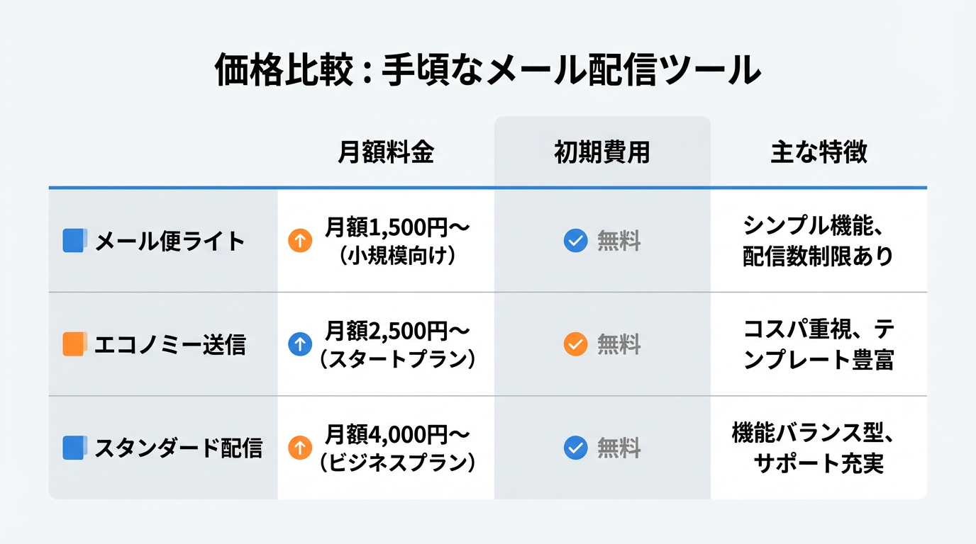 メール配信ツールの価格は、初期費用0円〜3万円、月額2,000円〜1万円程度が一般的な相場です。クラウド型のツールは初期費用が抑えられ、配信数や登録アドレス数に応じた従量課金制を採用しているケースが多いため、小規模事業者でも導入しやすくなっています。