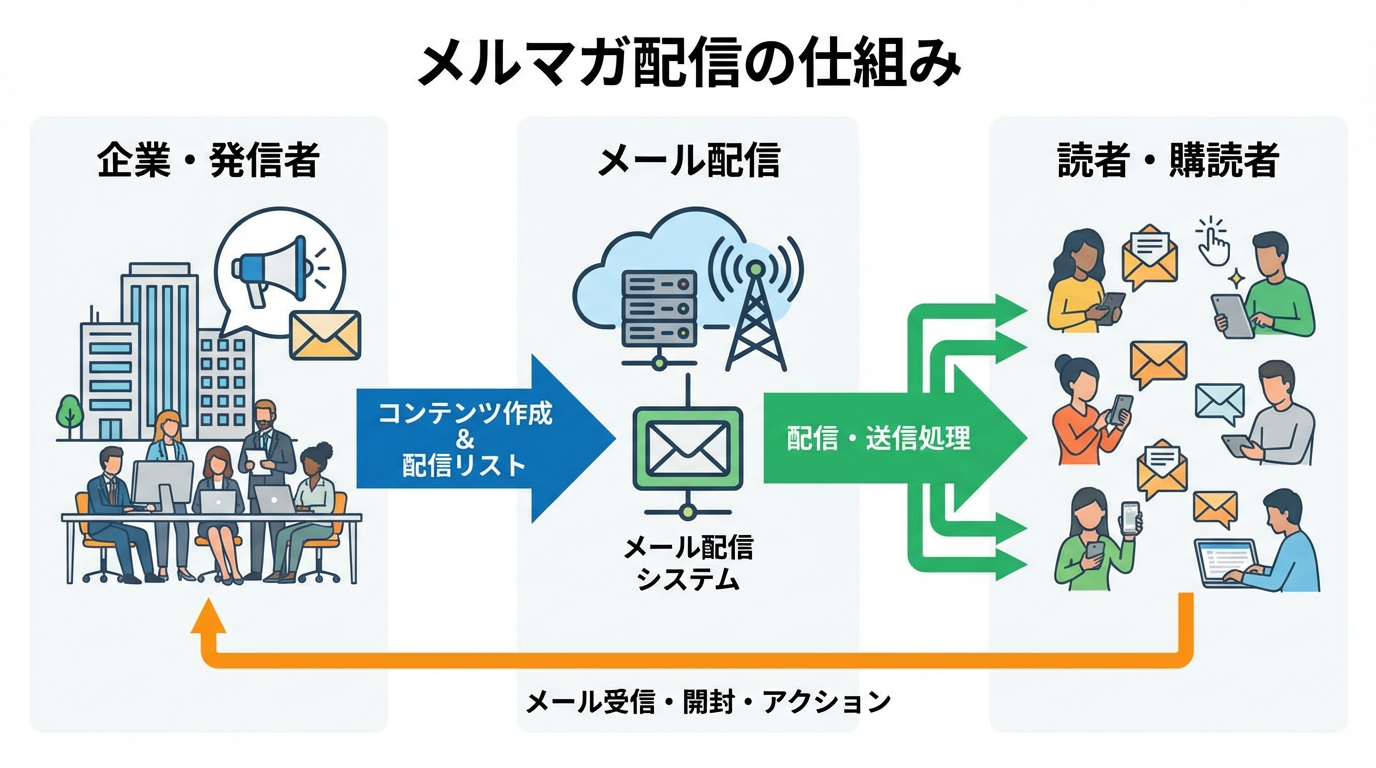 メルマガの配信は、次のような流れで読者のもとに届きます。