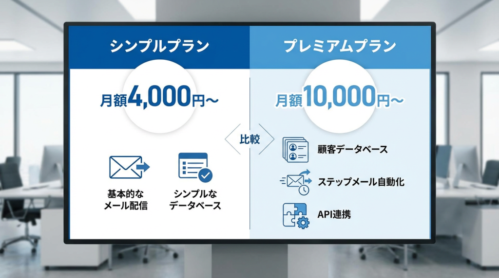 シンプルプランとプレミアムプランの最大の違いは「顧客データベースの管理機能」と「自動化機能」です。単発のメルマガ配信だけならシンプルプラン、マーケティングオートメーションや顧客育成を行いたい場合はプレミアムプランを選びましょう。