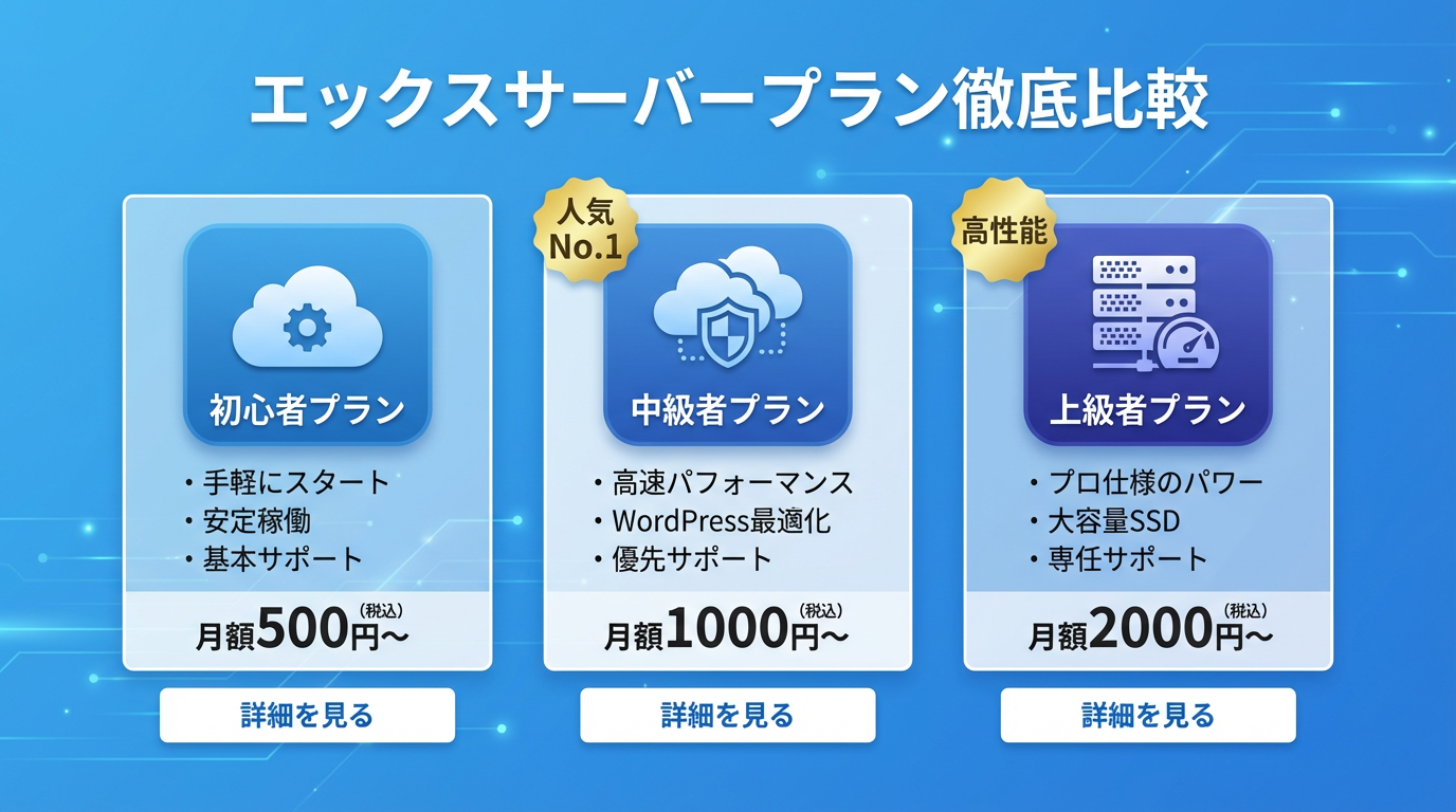 エックスサーバーでは、利用目的や規模に応じて選べる3つの料金プランを提供しています。