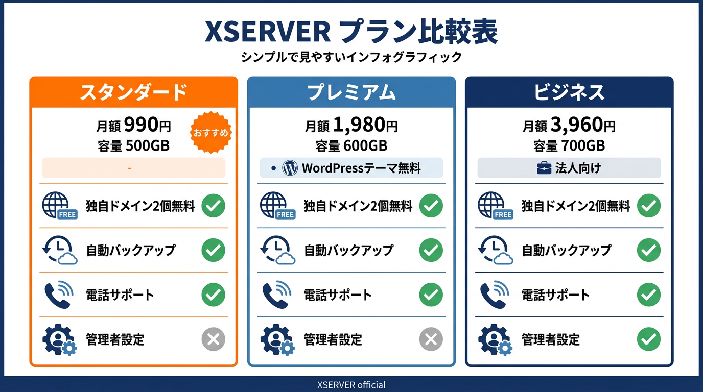 エックスサーバーは、個人から法人まで幅広く対応できる3つの料金プランを提供しています。まずは全体像を把握しましょう。