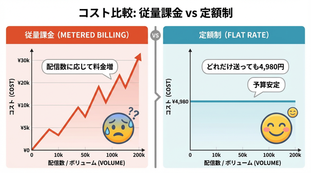 配信数が多いほど、従量課金制とのコスト差が顕著になります。