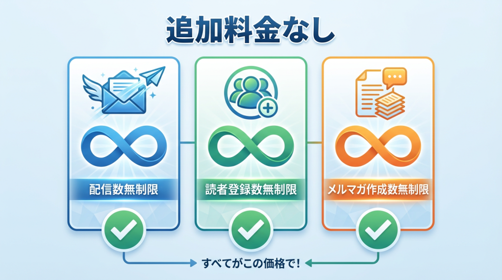 - 読者登録数無制限 – 何万人登録してもプラン変更不要