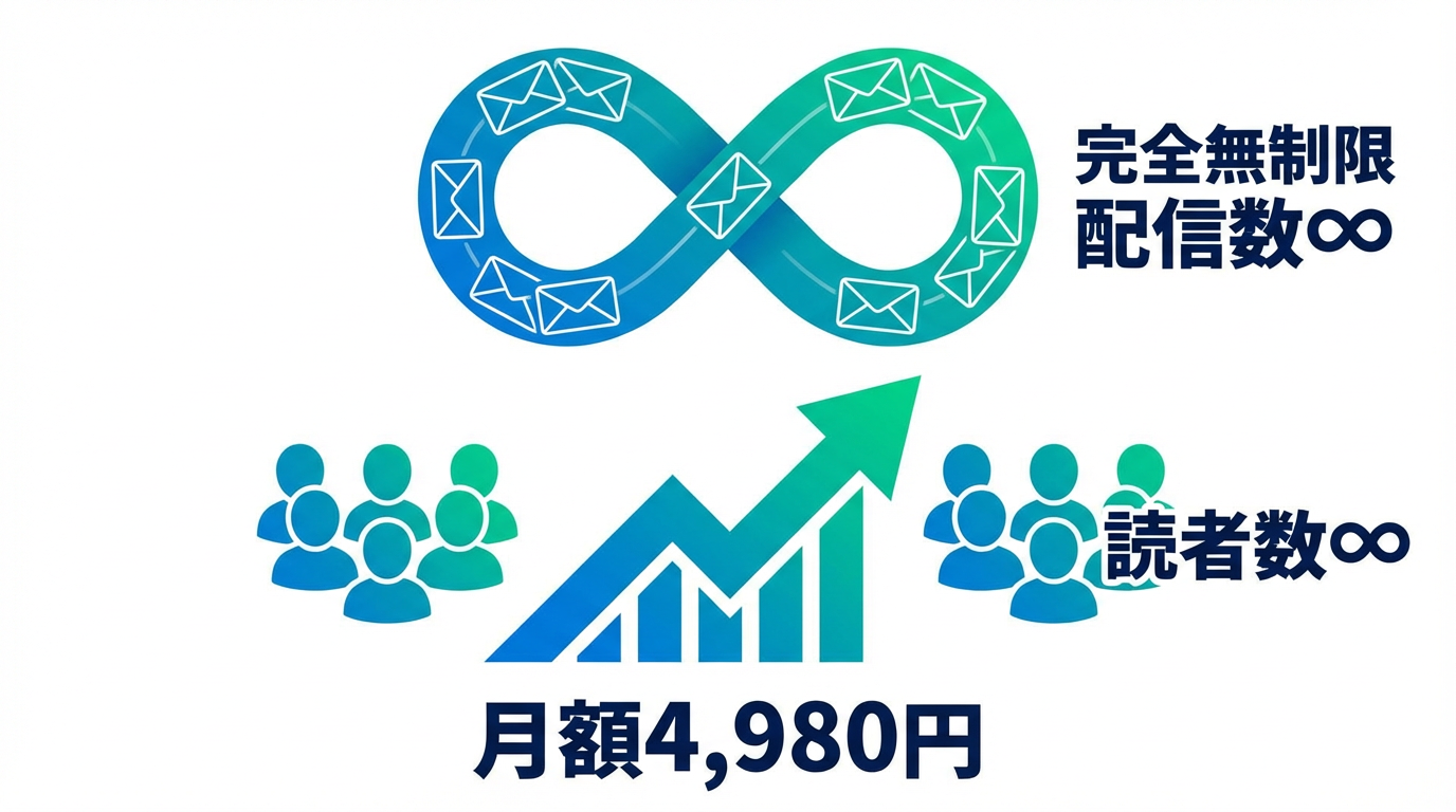 - 月額4,980円で配信数・読者数・メルマガ作成数が完全無制限